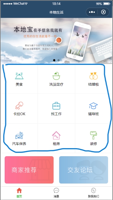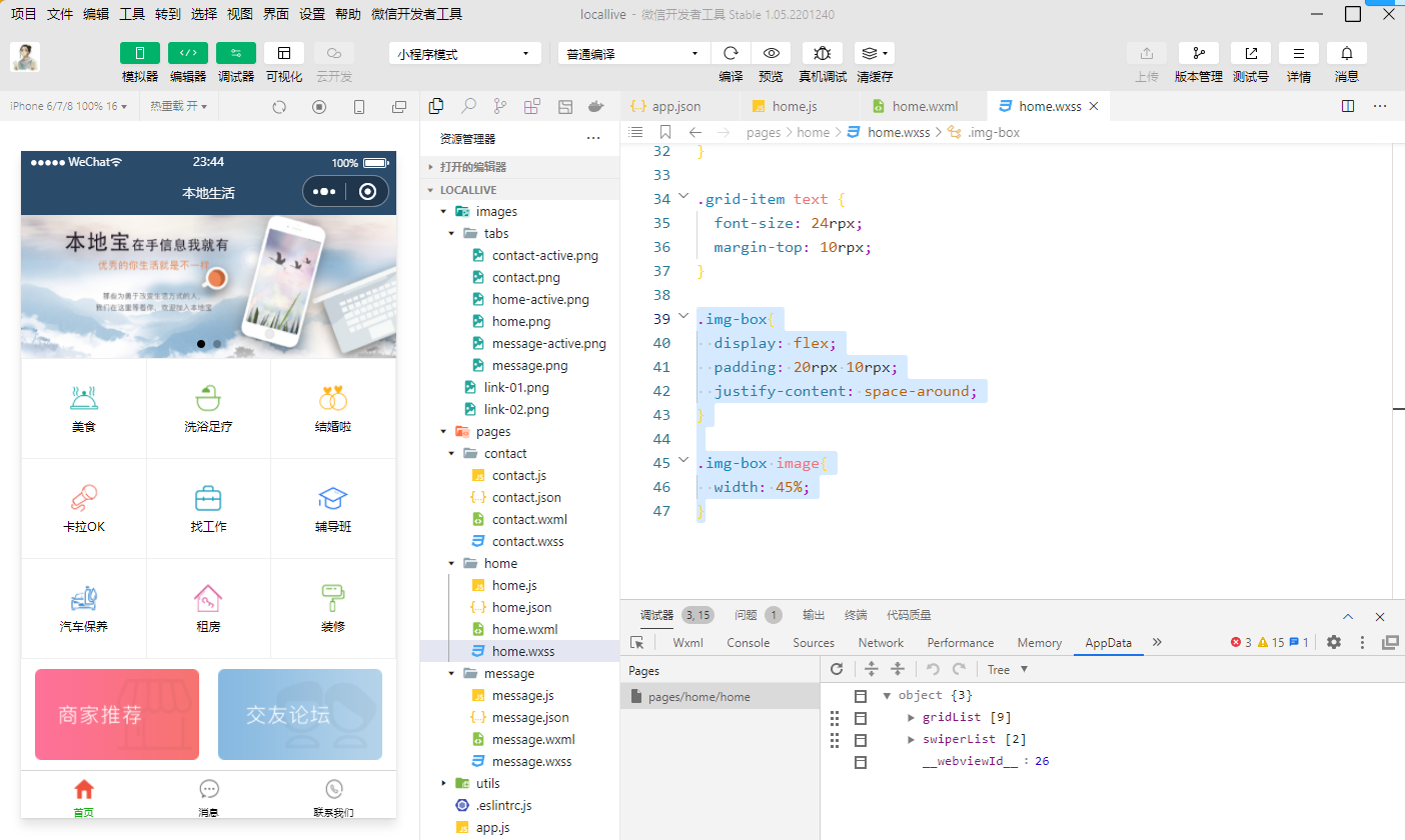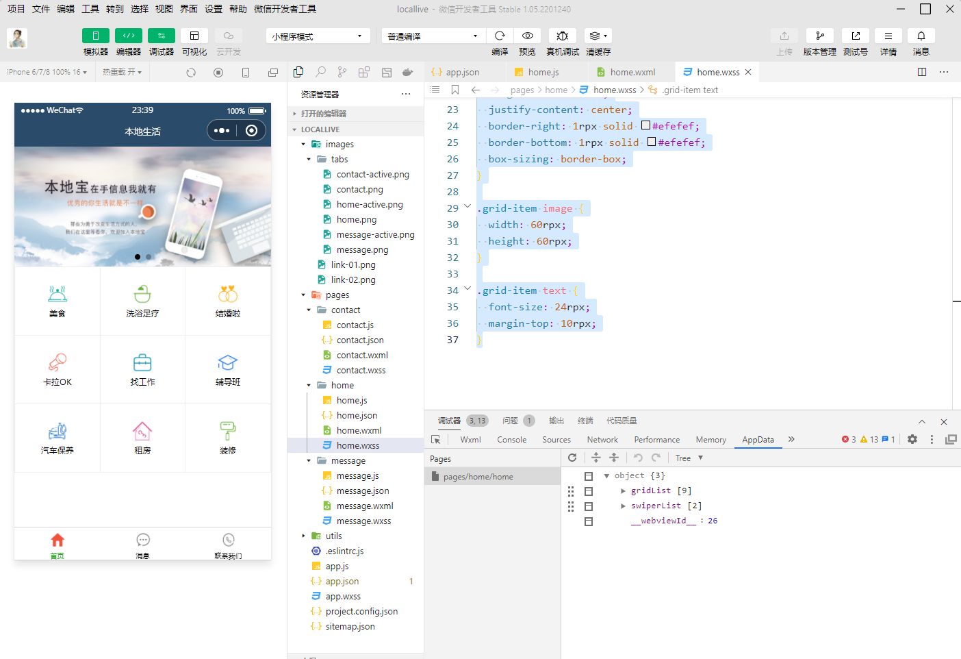获取九宫格数据,修改home.js文件,在data块添加gridlist数组,并且增加获取九宫格数据的方法,然后在onload中调用