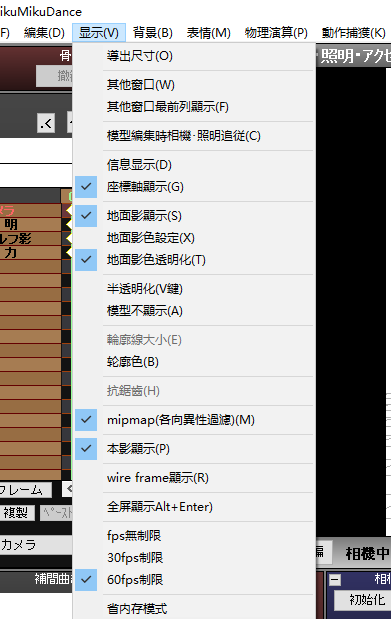 4.在每一次打开MMD工程文件时都要检查显示里的配置,因为Mikumikudance有时不会记忆用户的设置。