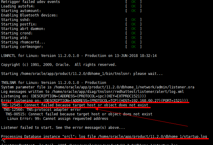 在确认“操作步骤”已经完全没问题,执行“netstat -luntp”依旧没看到 1521 端口的情况下,首先查看服务器自启动日志。