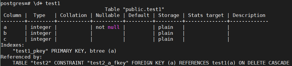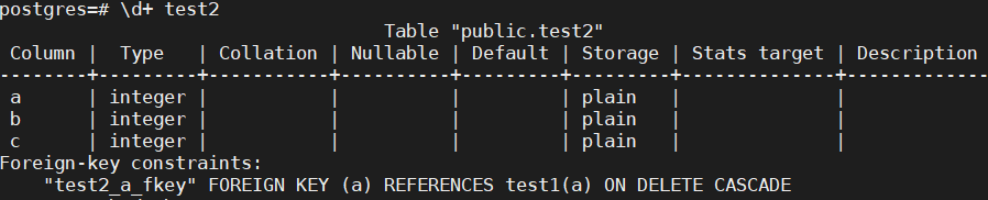 create table test2(a int references test1 on delete cascade,b int, c int);