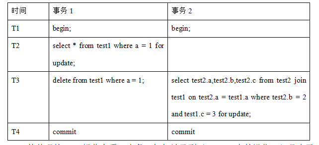 从表结构上可以看到,表test2和test1构成外键约束关系,并且是级联删除的关系,导致在删除TEST1表中的时候,数据库会自动请求对TEST2表中对应行的删除操作。根据业务操作模型,整理得到的执行SQL逻辑如下(这里仅仅列举出事务中涉及锁相关的操作,其他查询操作未列举出):
