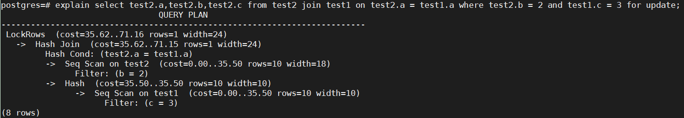 2019-09-01 21:01:08.359 CST [1482] STATEMENT: select test2.a,test2.b,test2.c from test2 join test1 on test2.a = test1.a where test2.b = 2 and test1.c = 3 for update;