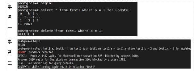 2019-09-01 21:01:08.359 CST [1482] DETAIL: Process 1482 waits for ShareLock on transaction 523; blocked by process 1610.
