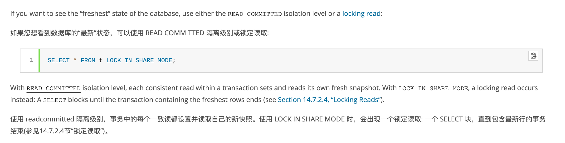 原文如上,翻译过来就是如果始终希望获取数据的最新状态,建议使用Read Committed 的隔离级别或者使用带锁的读取操作(如select lock in share mode/delete隐式读/update隐式读等 );也就是MySQL/Oracle除了普通的select操作,其他操作时都会去获取数据的最新当前读状态