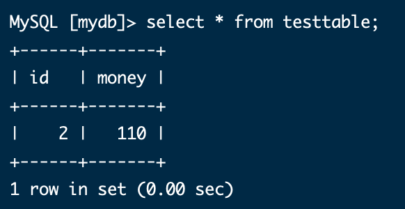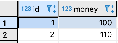 Create table test(id int,money int);