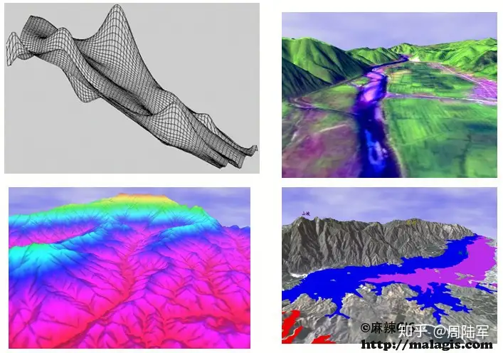 数字地形模型(Digital Terrain Mdel,DTM):用来模拟其他二维表面上连续变化的特征,比如地面景观的属性、地面温度、降水、地球磁力、重力、土地利用、土壤类型等地面特征信息。