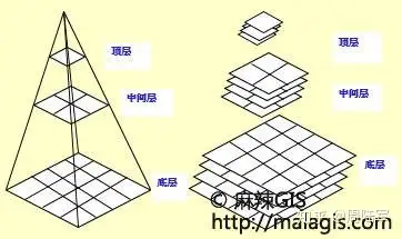 栅格、影像数据库采用金字塔结构存放多种空间分辨率的栅格数据,同一分辨率的栅格数据被组织在一个层面(Layer)内,而不同分辨率的栅格数据具有上下的垂直组织关系:越靠近顶层,数据的分辨率越小,数据量也越小,只能反映原始数据的概貌;越靠近底层,数据的分辨率越大,数据量也越大,更能反映原始详情。