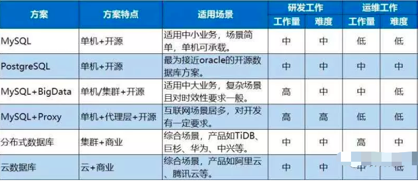 在应对策略上,首先要接受这一事实,功能差异是客观存在的。不存在一个完美的产品可以替代Oracle。此时能做的更多是细化场景分析,找出更适合项目情况的技术方案(或方案组合)。细化场景的目的,就是在于对功能需求做减法,找出替换功能边界,进而为后面的选型提供参考依据。如果是一个重度O的用户,就需要梳理所有场景,提出若干种差异化的技术方案来满足不同的需要。甚至针对同一场景,也要有几种方案可选,以面对成本、风险等其他因素的考虑。例如下图是多年前在公司整理的去O方案总结,其中场景部分正是基于上面的考虑。