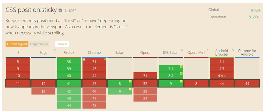 比较蛋疼的是这个属性的兼容性还不是很好,目前仍是一个试验性的属性,并不是W3C推荐的标准。它之所以会出现,也是因为监听scroll事件来实现粘性布局使浏览器进入慢滚动的模式,这与浏览器想要通过硬件加速来提升滚动的体验是相悖的。