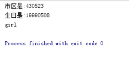 id='430523199905084345' area= id[0:6] birthday=id[6:14] sex=id[-2] print('市区是:'+area+'\n生日是:'+birthday) if (int(sex)%2==0): print('girl') else: print('boy')