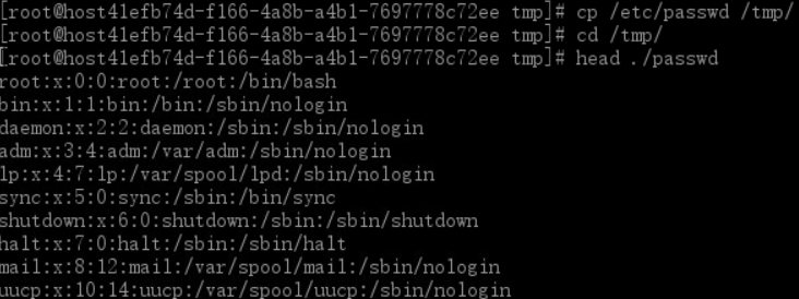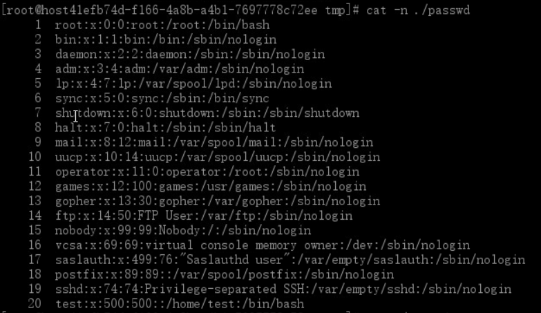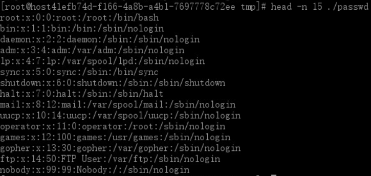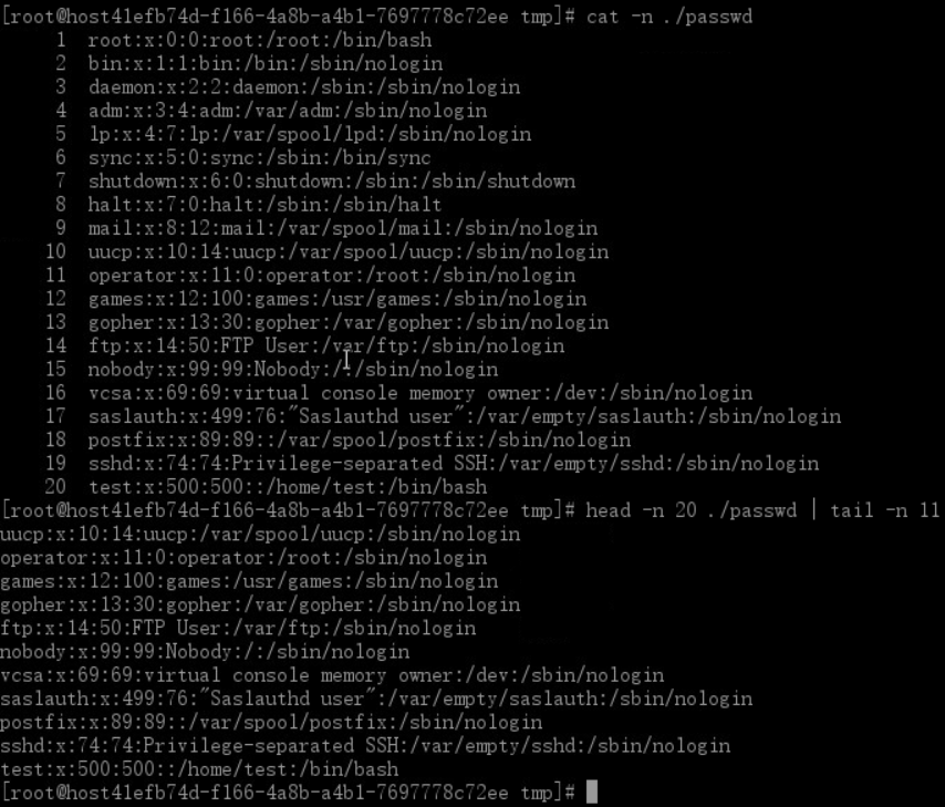 思考:如果要选取/tmp/passwd 文件的第10到20行的内容,可以先选取头20行,然后再取后11行。先用 head 选取前20行,然后把输出结果交给tail命令选取后11行内容