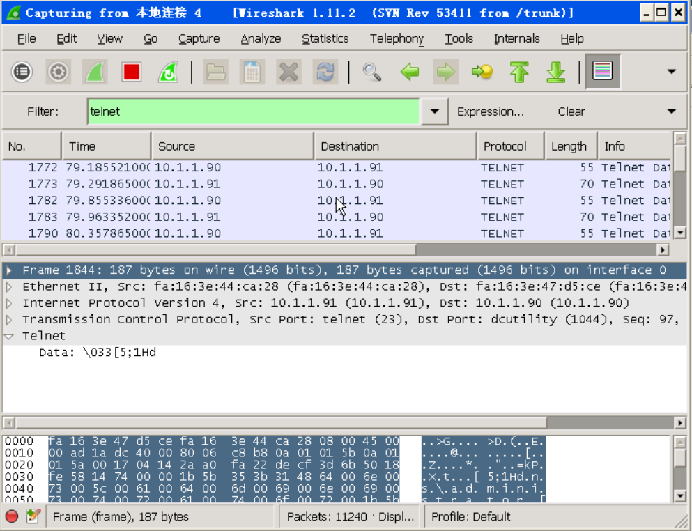 2.Client:到xp上,安装好Wireshark,然后Telnet server的IP,如telnet 10.1.1.44,然后就能看到欢迎界面