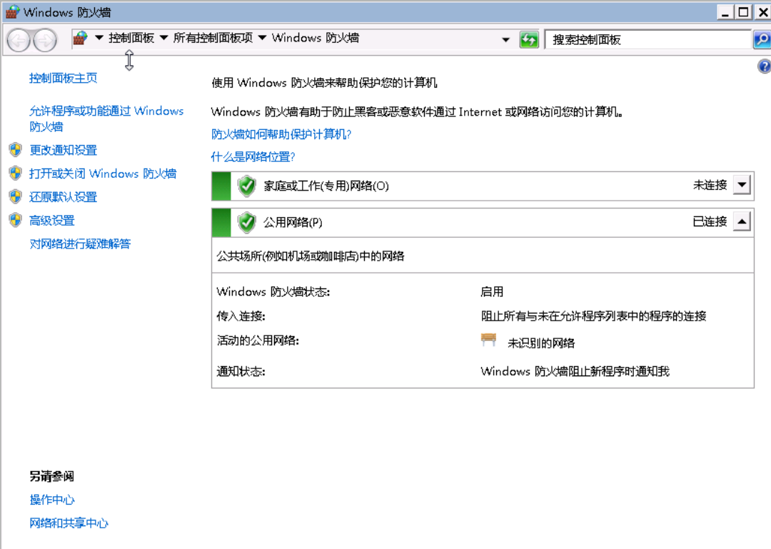 通过点击:开始-->控制面板-->系统和安全-->Windows 防火墙,出现“Windows防火墙”页面: