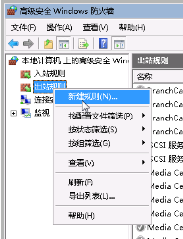 通过点击:开始-->控制面板-->系统和安全-->Windows 防火墙,出现“Windows防火墙”页面,点击“高级设置”,出现“高级安全Windows防火墙”设置页面,右键出站规则-->新建规则
