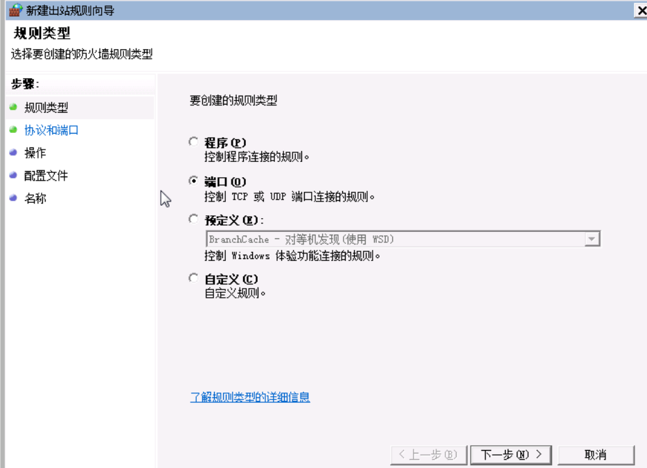 “规则类型”配置,选择“端口”,并点击“下一步”