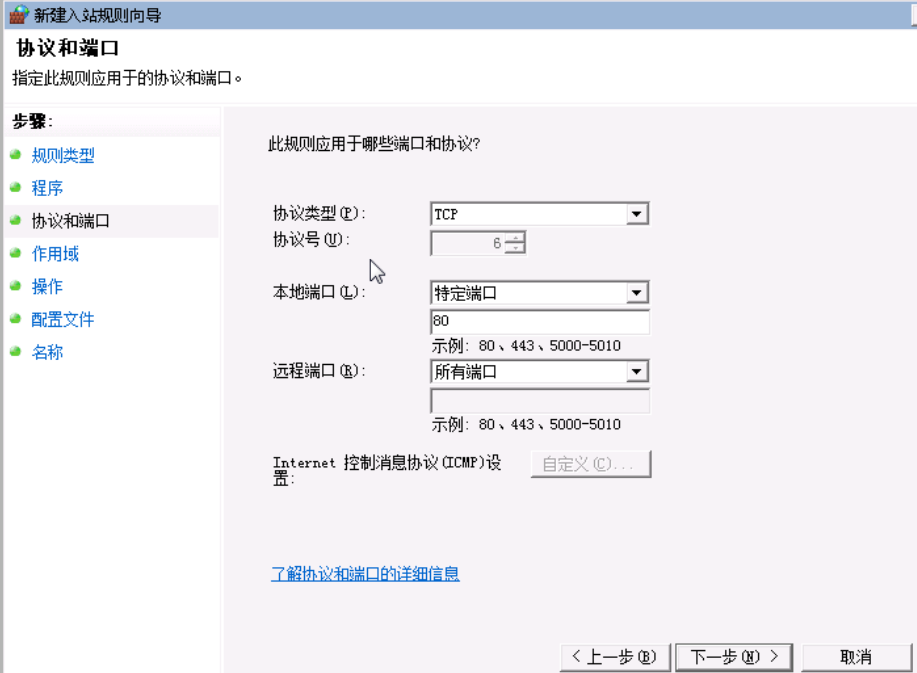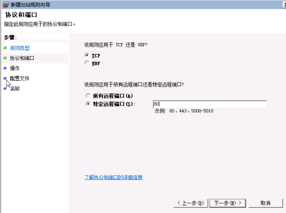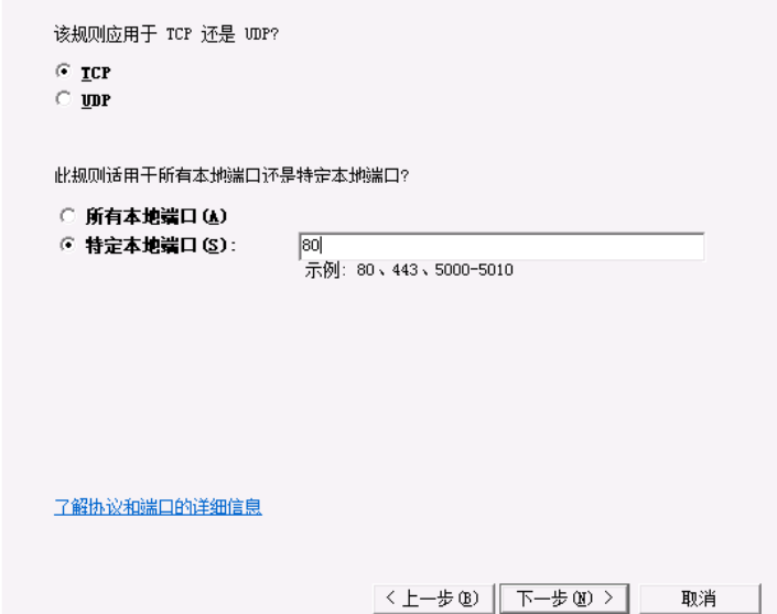 (3)在“协议和端口”配置界面,选择“TCP”,选择“特定远程端口”,输入“80”,点“下一步”。见下图: