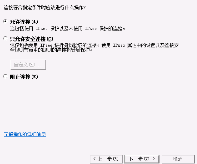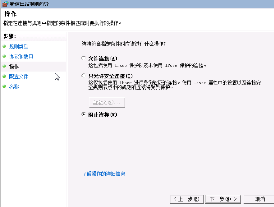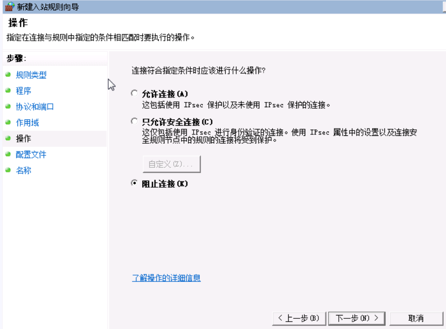 (4)在“操作”界面,选择“阻止连接”,点“下一步”。