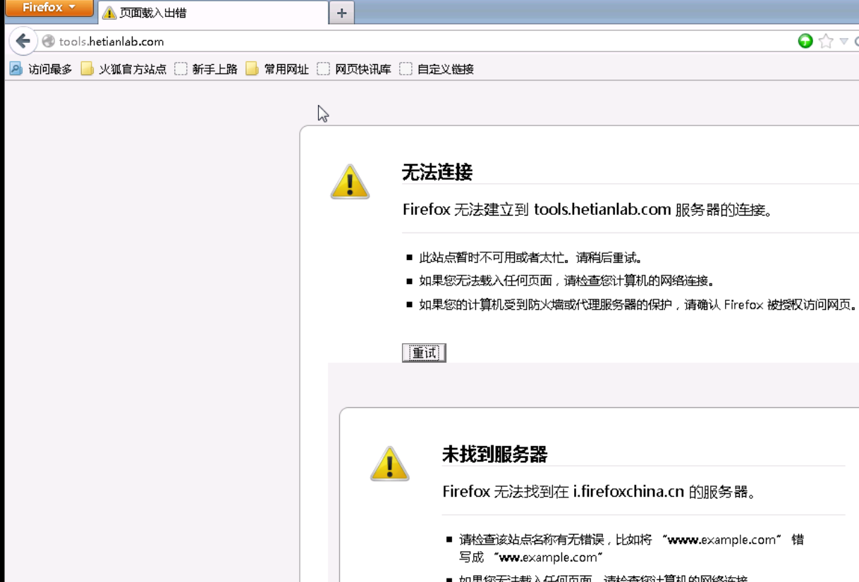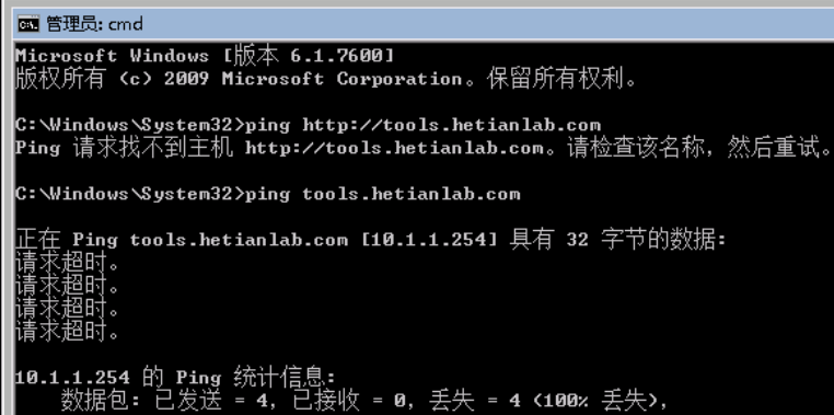 打开浏览器,此时已经无法访问http://tools.hetianlab.com。但可ping通。截图中返回了IP地址说明是通的,请求超时只是网站为了安全而设置的禁ping策略。