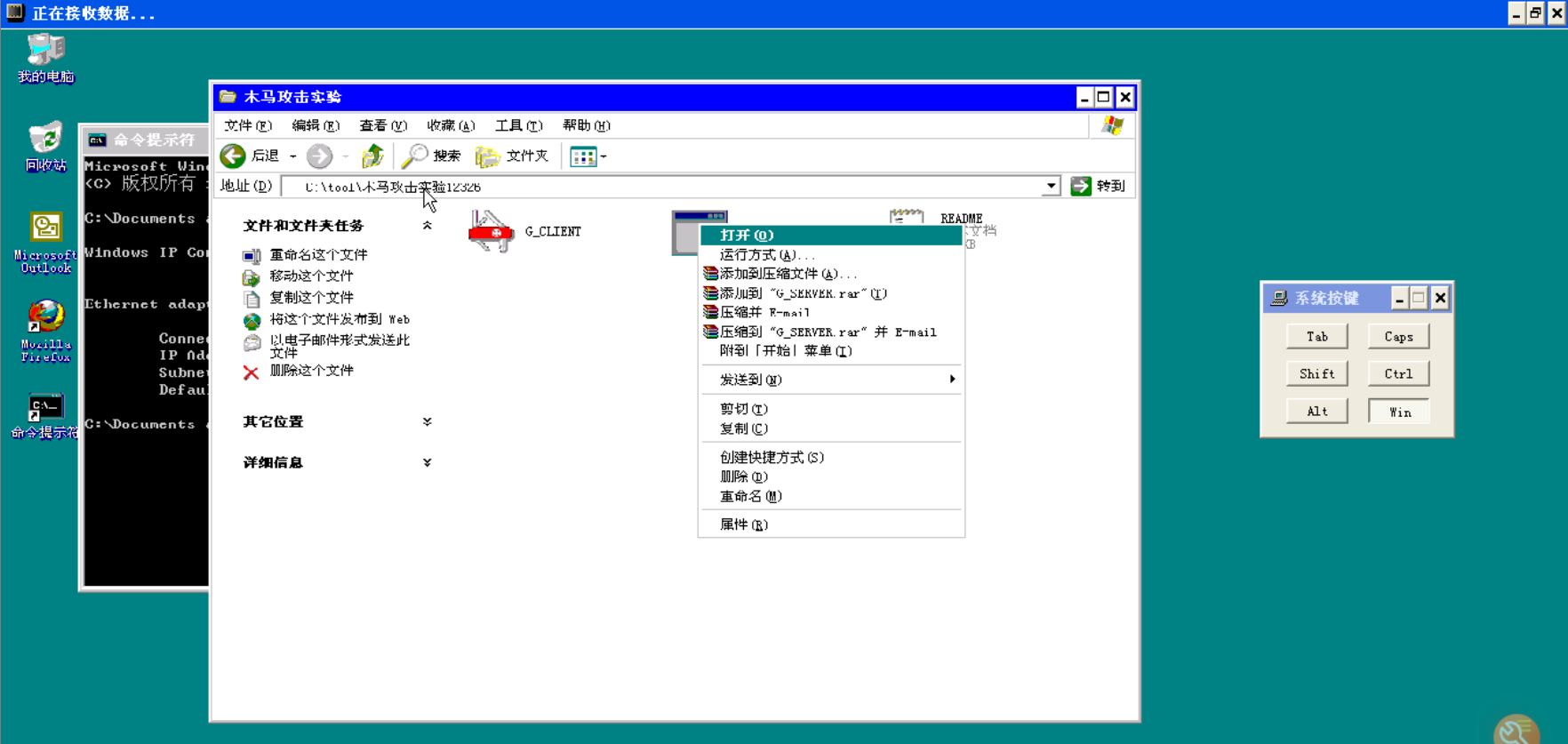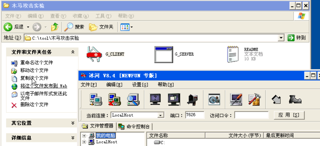 (2)客户端。打开C:\tool\“木马攻击实验”文件夹,在“冰河”文件存储目录下,双击G_CLIENT。G_Client是木马的客户端,即木马的控制端。此时,会弹出“Windows安全警报窗口”如图2,点击“解除阻止”,则可打开控制端。