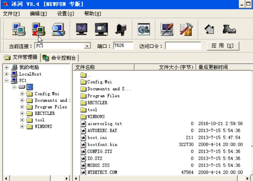 单击添加的主机(PC1)出现如图6添加主机界面,如果连接成功,则会显示服务器端主机上的盘符如图7服务器端主机盘符。这时我们就可以像操作自己的电脑一样操作远程目标电脑.