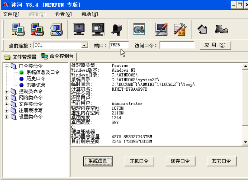 “系统信息及口令”:可以查看远程主机的系统信息,开机口令,缓存口令等。可看到非常详细的远程主机信息,这就无异于远程主机彻底暴露在攻击者面前