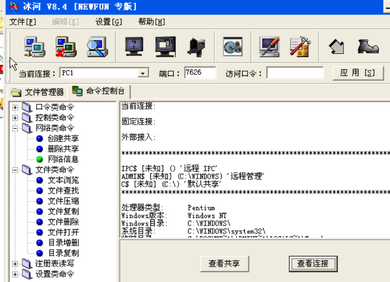 该类命令中,“文件浏览”、“文件查找”、“文件压缩”、“文件删除”、“文件打开”等菜单可以查看、查找、压缩、删除、打开远程主机上某个文件。“目录增删”、“目录复制”、可以增加、删除、复制远程主机上的某个目录。