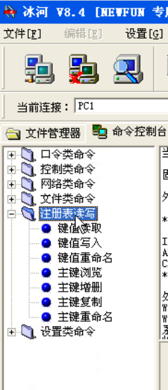 点击“命令控制台”,点击“注册表读写”前面的“+”即可展开“注册表读写”命令,如图注册表读写。