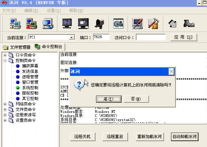 点击“控制类命令”前面的“+”,点击“系统控制”可看到“自动卸载冰河”按钮并点击,在弹出的窗口里面点击“是”,则可以卸载远程主机上的木马如图自动卸载冰河木马。