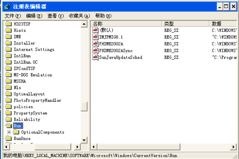 上面两个注册表的子键目录Run和Runservices中存放的键值是系统启动时自动启动的程序,一般病毒程序,木马程序,后门程序等都放在这些子键目录下,所以要经常检查这些子键目录下的程序,如果有不明程序,要着重进行分析。