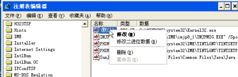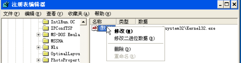 在目录中也发现了一个默认的键值C:\WINNT\System32\kernel32.exe,这也是“冰河”木马在注册表中加入的键值,将它删除