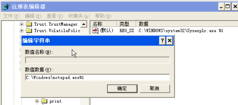然后即可出现如下窗口,将数值数据C:\Windows\System32\Sysexplr.exe%1改为正常情况下的C:\Windows\notepad.exe%1即可,如图19修改编辑字符串,最后重新启动计算机,冰河木马就彻底删除了。