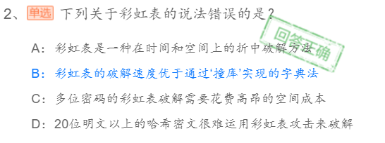 (1)“加盐”:彩虹表只能通过有限密码集合生成查找表——当密码集合扩大,彩虹表占用的空间将以指数速度增加。因此目前最常用的方式是将用户密码添加一段字符串(盐化)后再做散列。