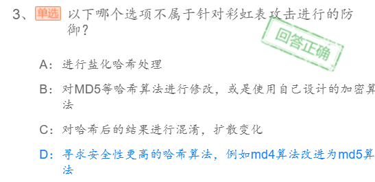 (2)已知彩虹表是应用于主流的哈希算法的,那么通过对哈希算法进行修改,自然能够防御彩虹表破解。