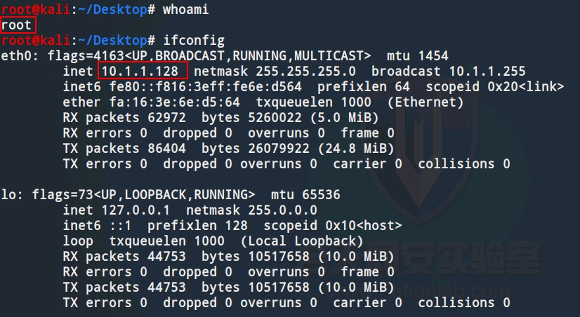 (3)查看攻击者主机登陆用户及网络配置信息,从下图3可以看出攻击主机登陆用户为root ,IP为10.1.1.128:whoami 查看当前登陆用户 ifconfig 查看网络配置信息