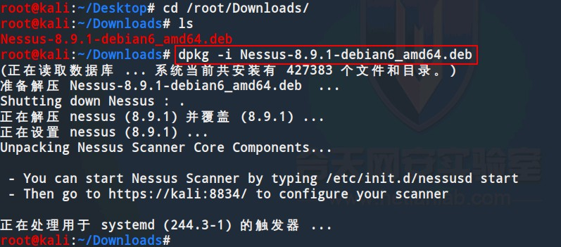 (4)在Nessus官网下载页面选择适合Kali linux的安装程序。经实验证明多个版本的都可以在kali linux上安装成功,这里选择“Debian 6,7,8,9/Kali Linux 1,2017.3 AMD64”版本程序。下载之后,拷贝到Kali linux主机上,运行下列命令进行安装:dpkg -i Nessus-8.9.1-debian6_amd64.deb 安装Debian安装包