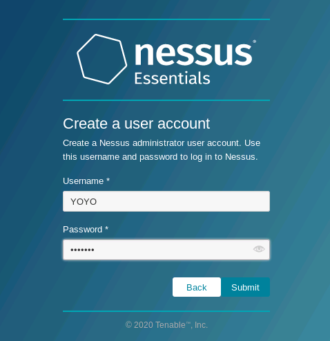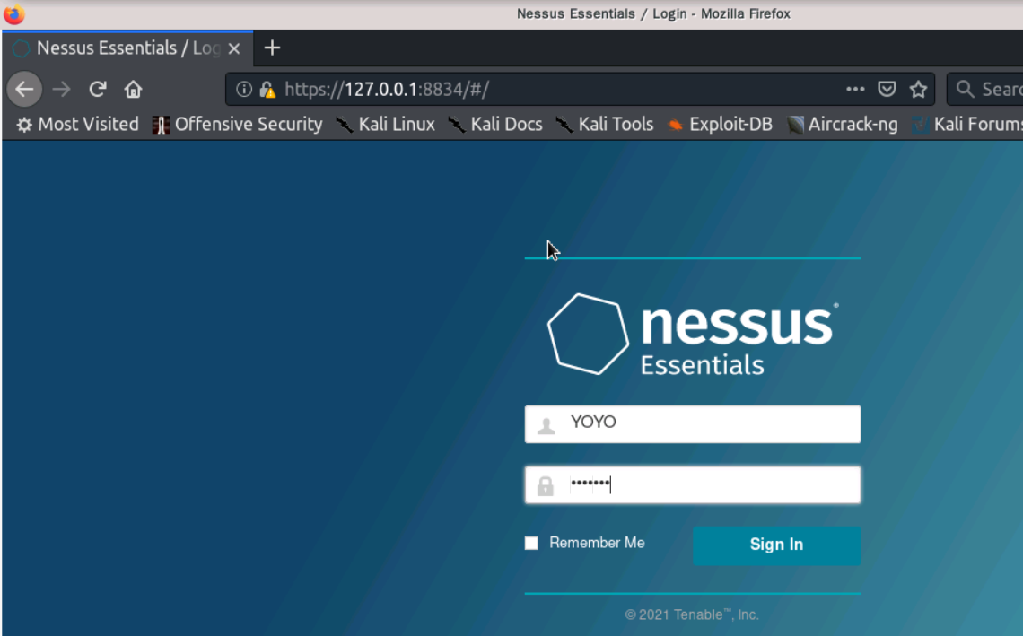 访问Nessus控制端https://127.0.0.1:8834/。输入安装时设置的账号信息