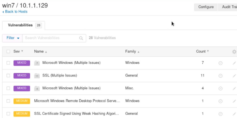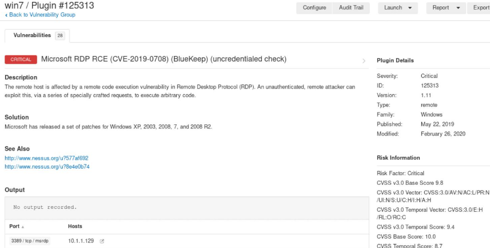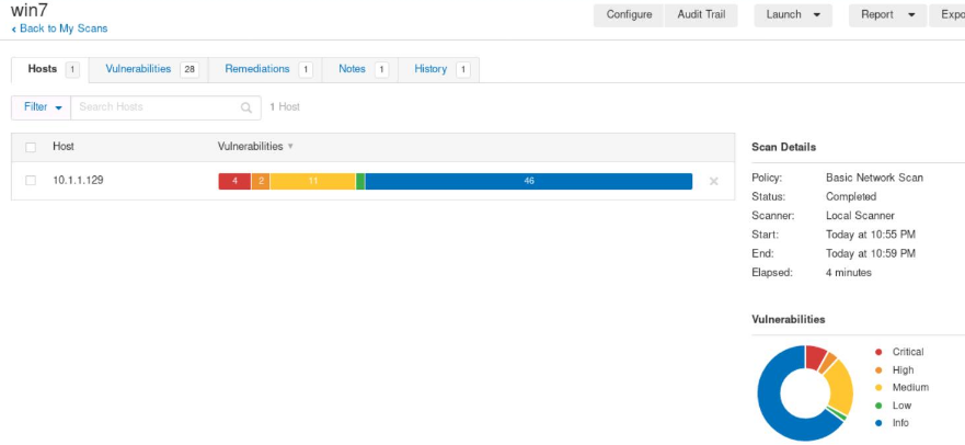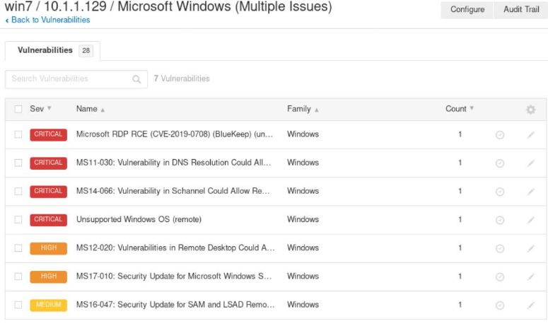重点关注10.1.1.129主机,即win7靶机,Nessus扫描出该主机存在四个最高危漏洞、2个高危漏洞及其它漏洞问题。