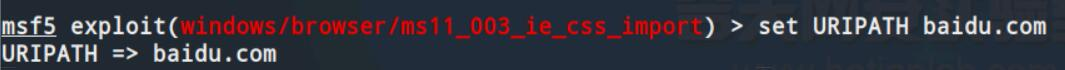 (4)设置生成的恶意网页的URI为baidu.com:运行命令:set URIPATH baidu.com