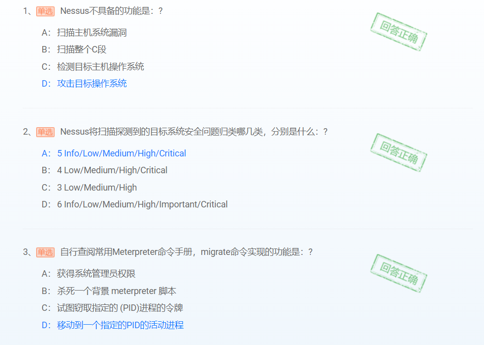 熟悉了Nessus漏洞扫描工具的安装和主机漏洞扫描的方法,学会了利用Nessus扫描结果筛选合适的Metasploit攻击模块进行安全测试、攻击。