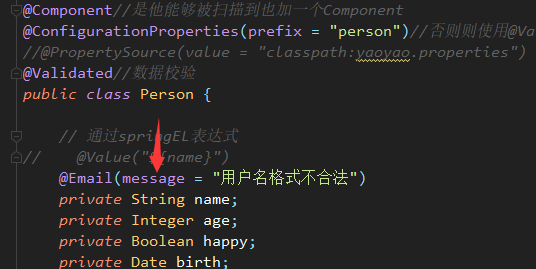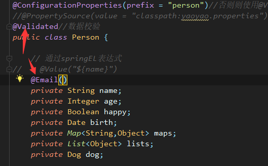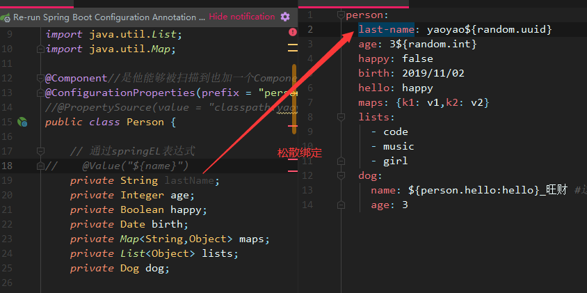 类中的属性可以是驼峰命名法可以与配置文件中的这种写法绑定,但是value则没有松散绑定