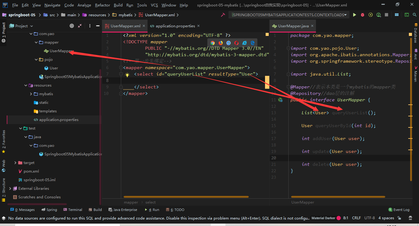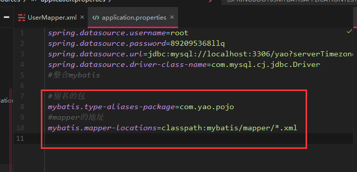 但是我们这里发现这个UserMapper.xmlspringboot无法识别,而且还需要定义别名等等问题,因此需要在application.properties