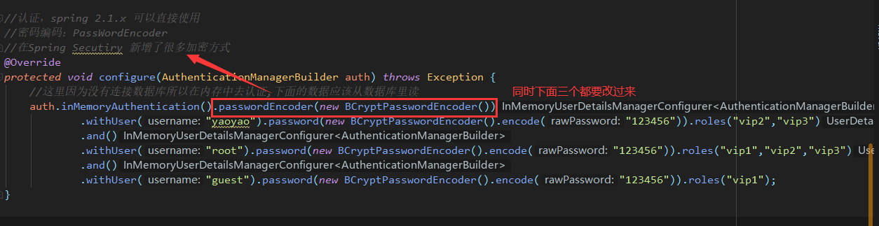 .withUser("yaoyao").password(new BCryptPasswordEncoder().encode("123456")).roles("vip2","vip3")