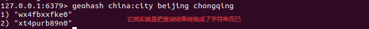1.2.6 geohash (该命令将返回11个字符的Geohash字符串,两个字符串越接近那么距离越近)