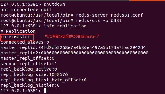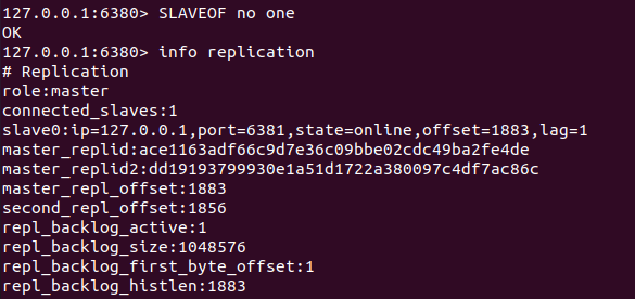 salveof no one,如果主机断开了连接,可以使用这个命令来让自己成为主节点,其他的结点就可以手动连接到最新的这个主节点