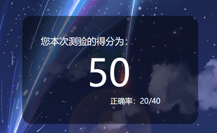 6、最后一题提交后,界面显示分数,分数根据答对的百分比计算;