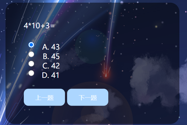 题目显示设计:这个题目显示功能的实现,是后端生成随机题目之后,将题目,正确答案,四个选项都放进一维数组中,后端将这个一维数组传送给前端,前端在js部分对一维数组的数据进行处理并显示在页面对应的位置。