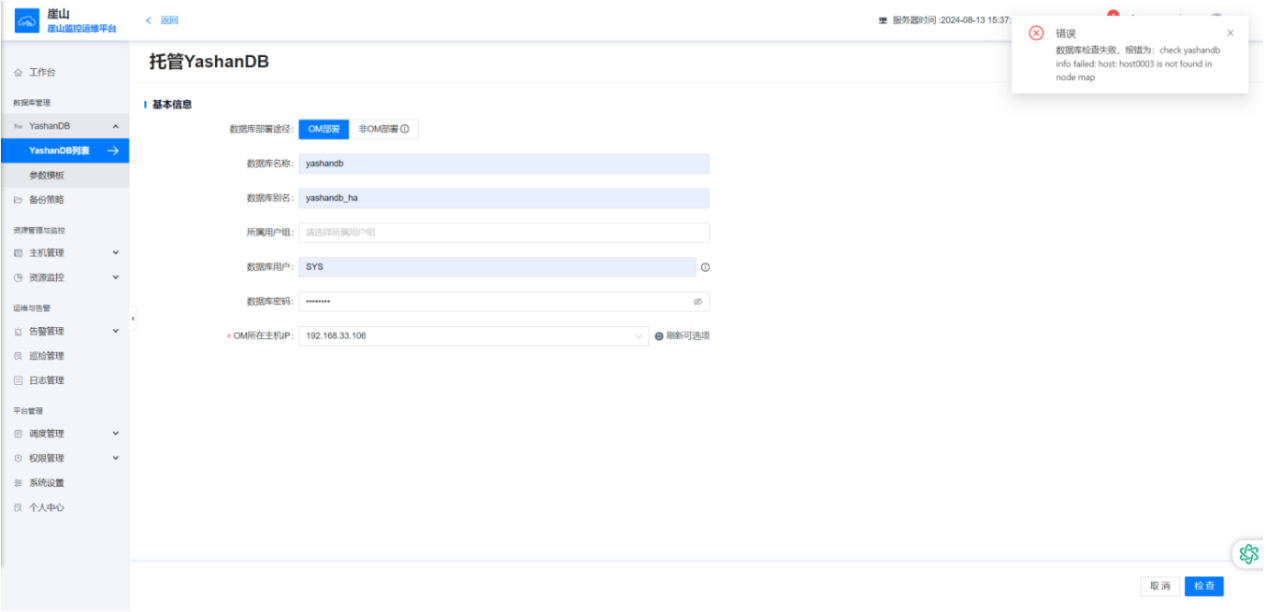 紧接着尝试通过 YCM(Yashan Control Manager)托管此缩容后的数据库时,系统提示: