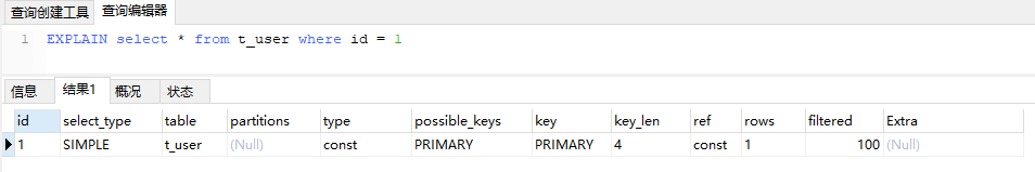 也就是说当查询的结果集只有一行时会采用const连接,比如当用主键作为条件查询或者用不重复索引作为条件是将用const